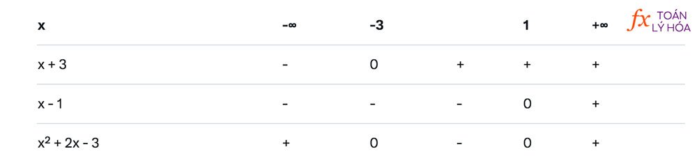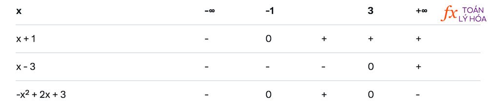 - Bước 3: Bất phương trình > 0 → Nghiệm: x < -1 hoặc x > 3.